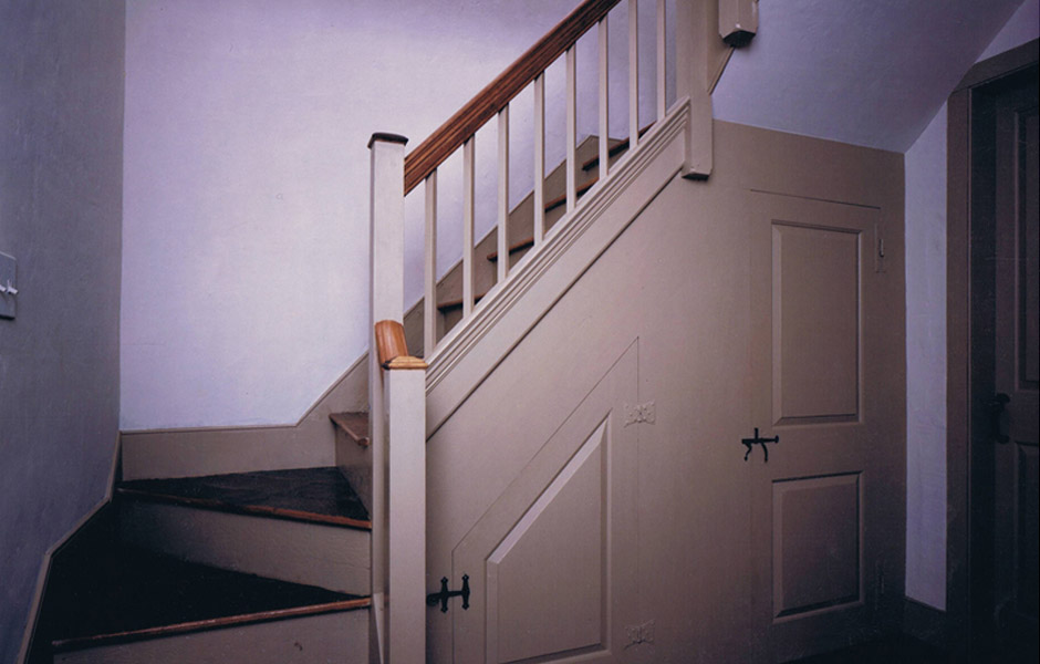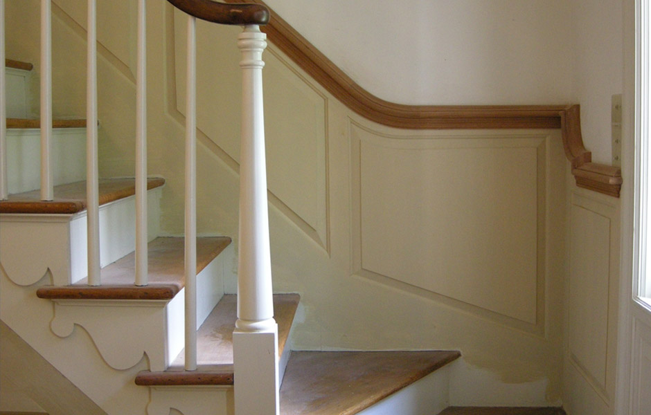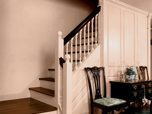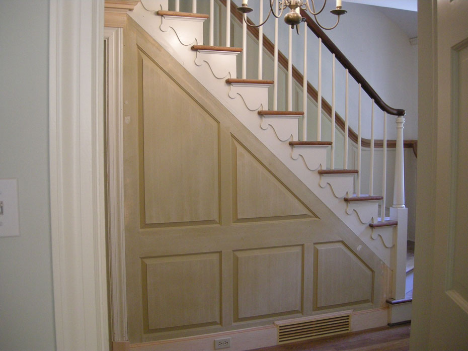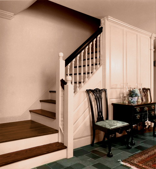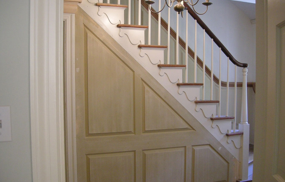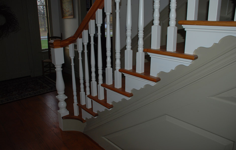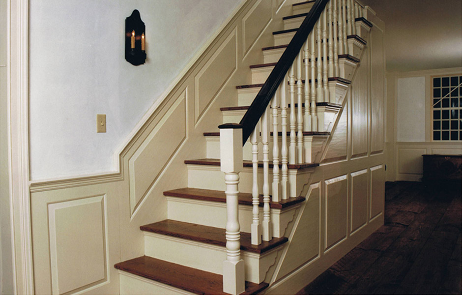 An authentic entrance to a special home.. We detail the 18th century staircase in simple or elaborate treatments. Based on the finest examples found in early New England homes. With hand carved balusters, raised paneling and scroll bracket detail, the result is a beautiful piece of woodwork providing your home with an entry of very special interest.
